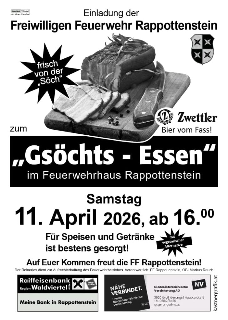Am Samstag, 11. April 2026 ab 16:00 Uhr gibt es frisches Gsöchts – direkt von der Söch. Dazu servieren wir passende Beilagen sowie Zwettler Bier vom Fass und weitere Getränke – auch eine vegetarische Alternative wird angeboten.